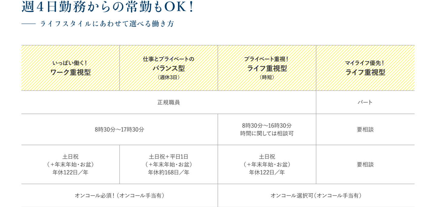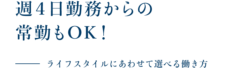 常勤は4日~、非常勤は半日~調整可能です。午前・午後勤務などの実績があります。まずは、ご相談ください。