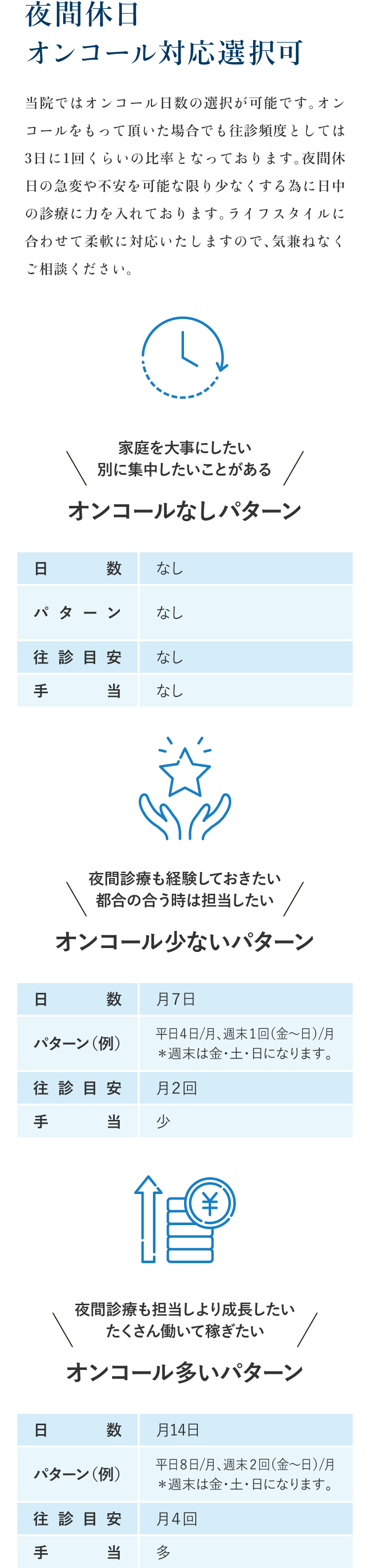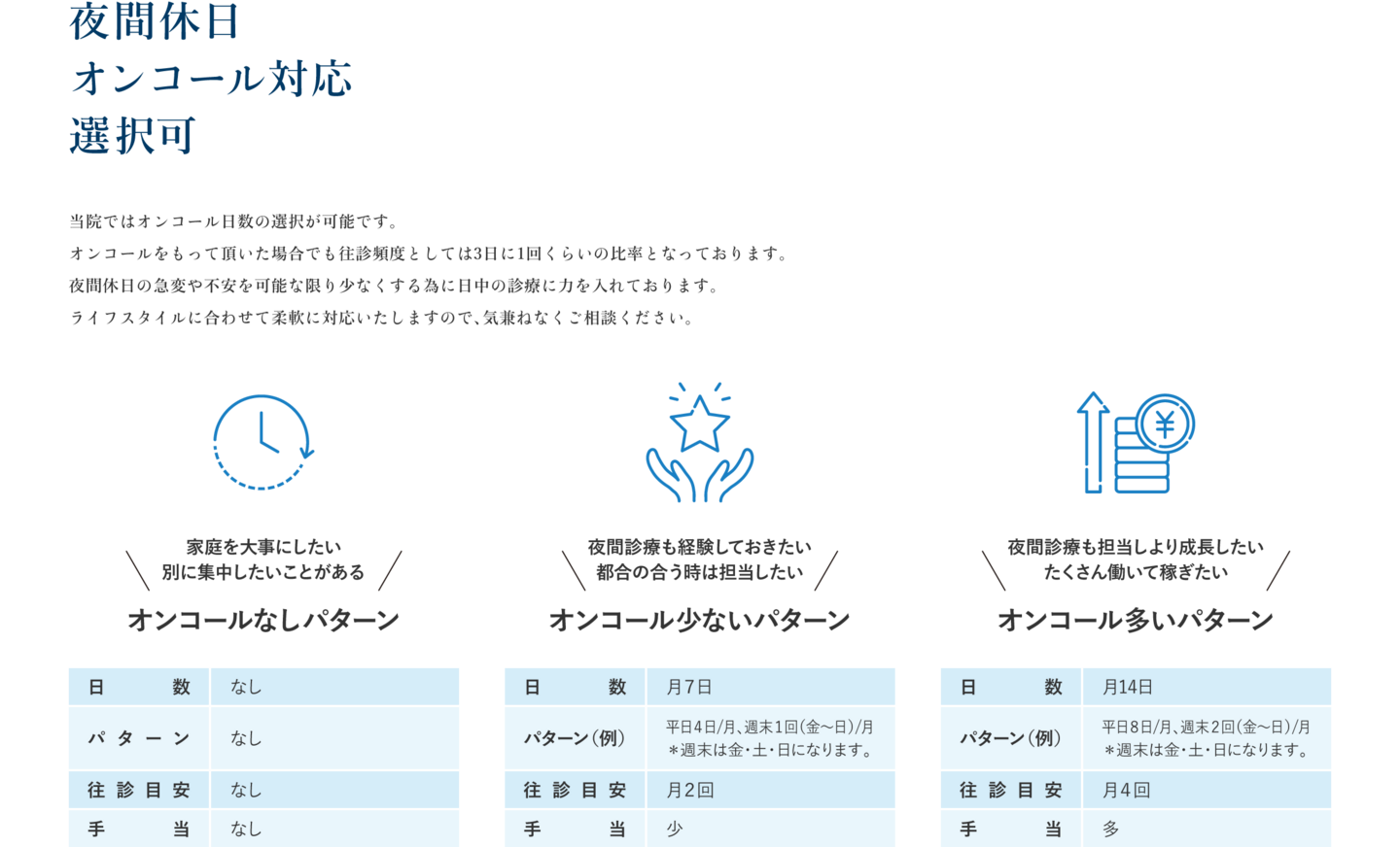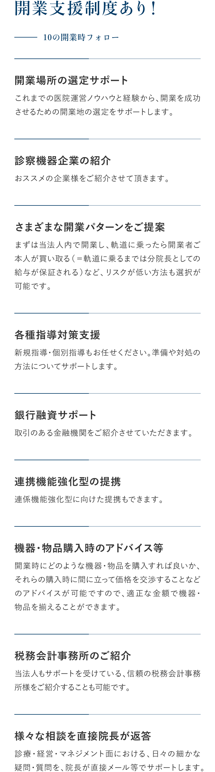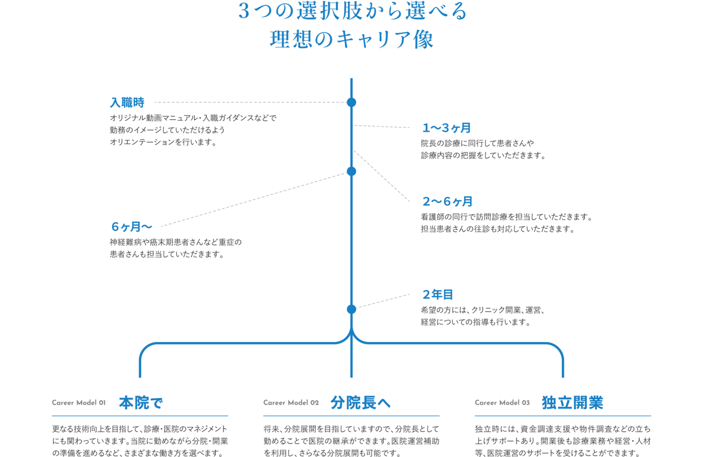 ございます。ただし、一定期間、当院で勤務(定期非常勤半年から)頂くことが条件です。現場のオペレーションスキーム、診療所経営・運営、育成システムなど、惜しみなく提供します。