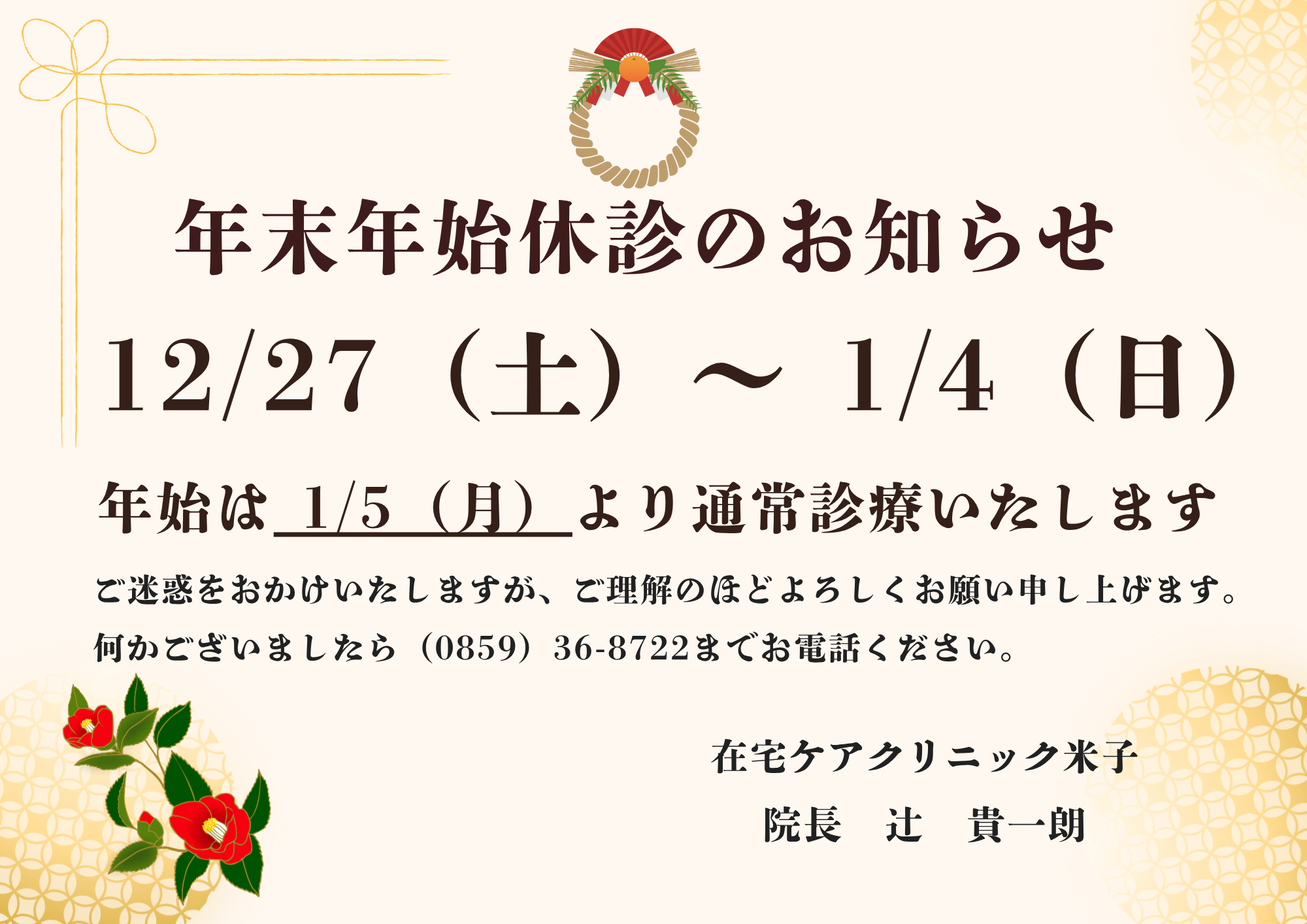 | 2025/06/01 | 常勤医師が2名入職しました。 足立康ニ 医師 足立奈緒子 医師(7/1~在宅ケアクリニック松江勤務) |